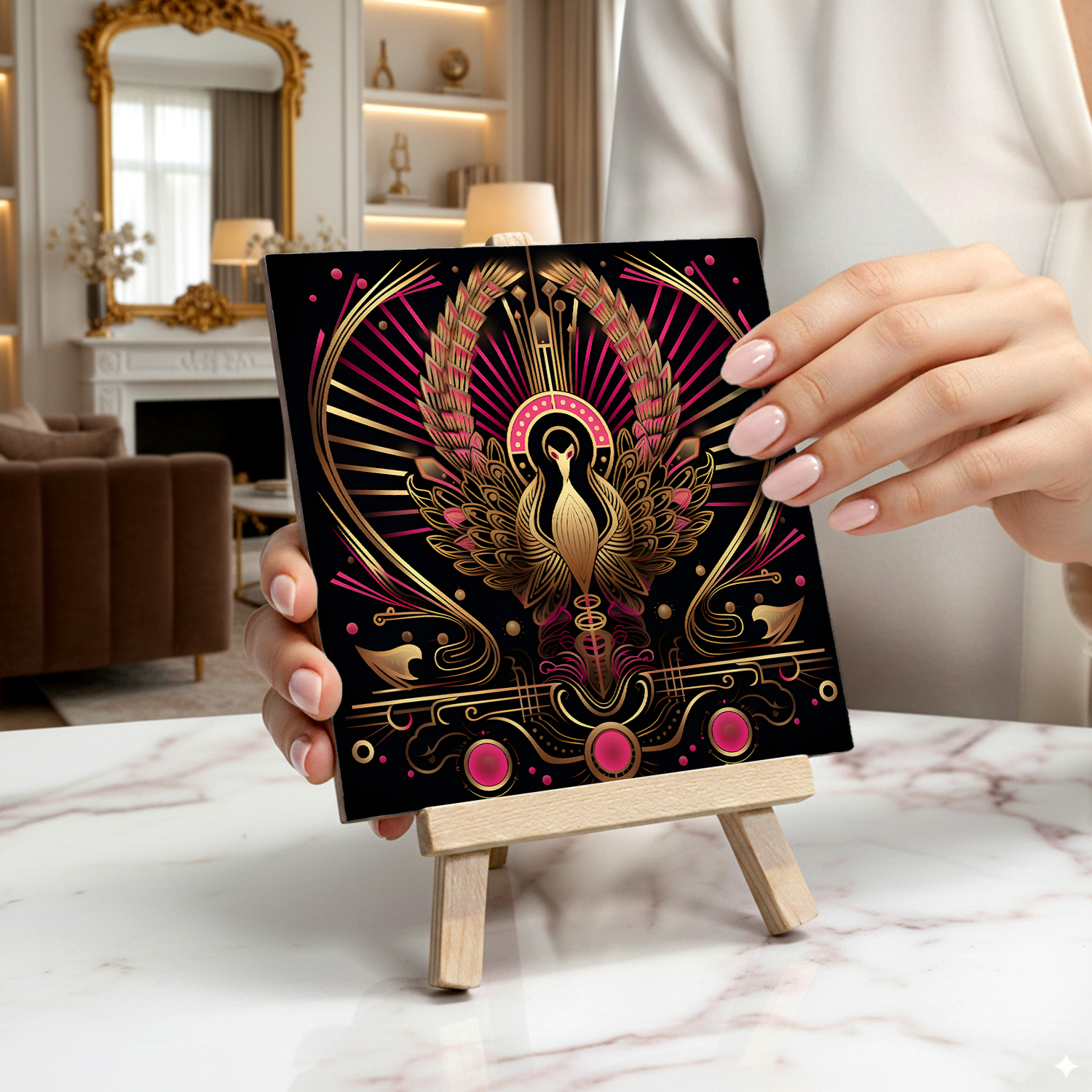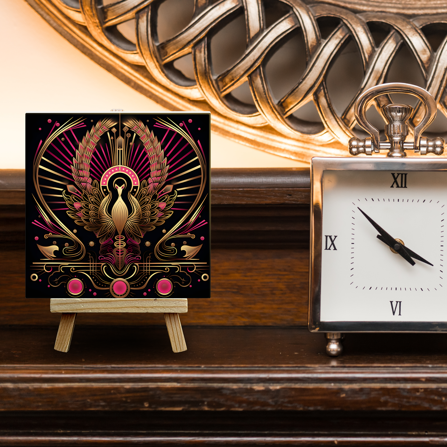 Presented on a natural wooden easel, this elegant 4.25" ceramic tile offers a compact and stylish display, perfect for desks, shelves, or mantelpieces. Its refined design adds character and creativity to your home decor, whether displayed individually or as part of a curated collection.