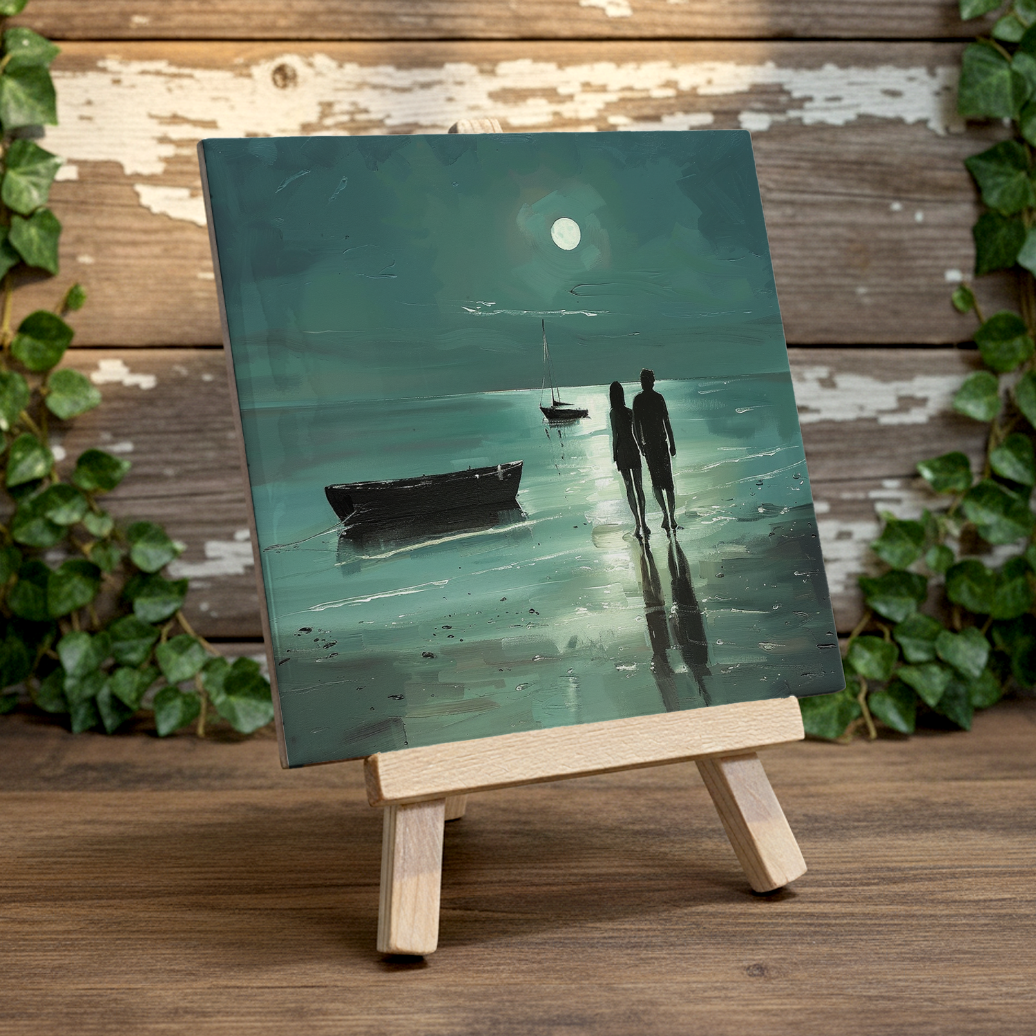 Bathed in moonlight, a couple walks along a silvery shoreline. The gentle glow of the sea under the stars captures quiet connection and calm.