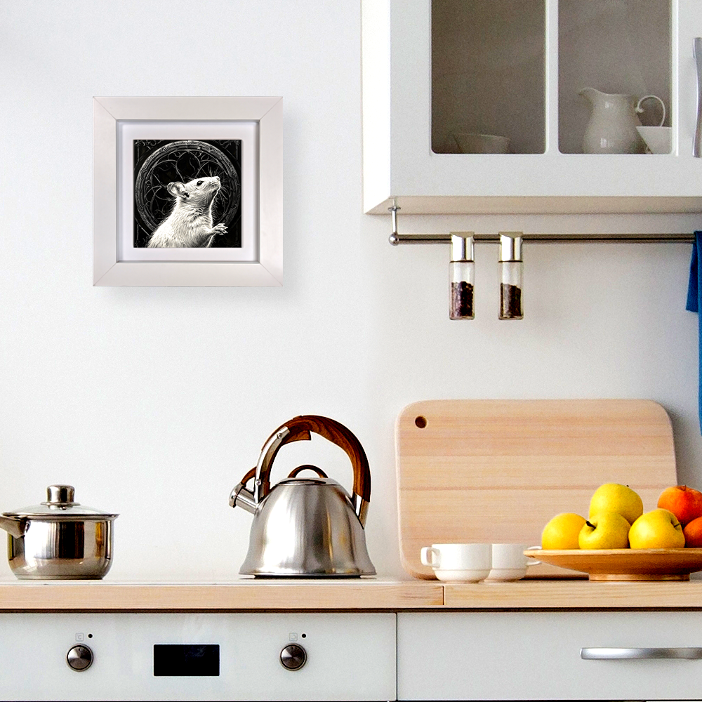Quiet and curious, Mouse is a beautifully lit gothic animal portrait with delicate charm and dark undertones. The intricate frame and muted tones make this a gentle but compelling addition to any dark home décor setup.